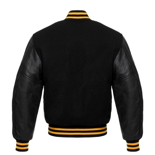 Deluxe Varsity Collegejacke – Black Wool & Gold Leather Sleeves | Unisex Gothic Bomber Retro Look