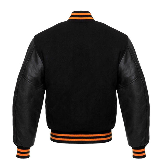 Black Wool Varsity-Jacke mit Black Leather Sleeves – Unisex College Retro Letterman Gothic Streetwear Bomberjacke
