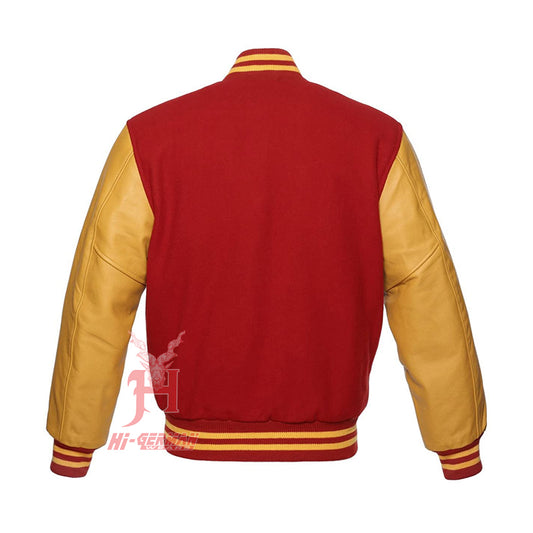 Bold Red Collegejacke aus Wolle mit goldenen Lederärmeln – Unisex Gothic Letterman Bomber Retro Jacke
