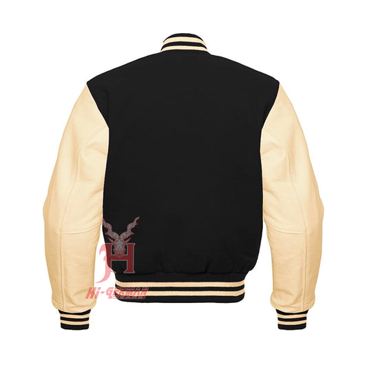 Black Wool Varsity-Jacke mit Cream Leather Sleeves – Unisex Retro College Letterman Style