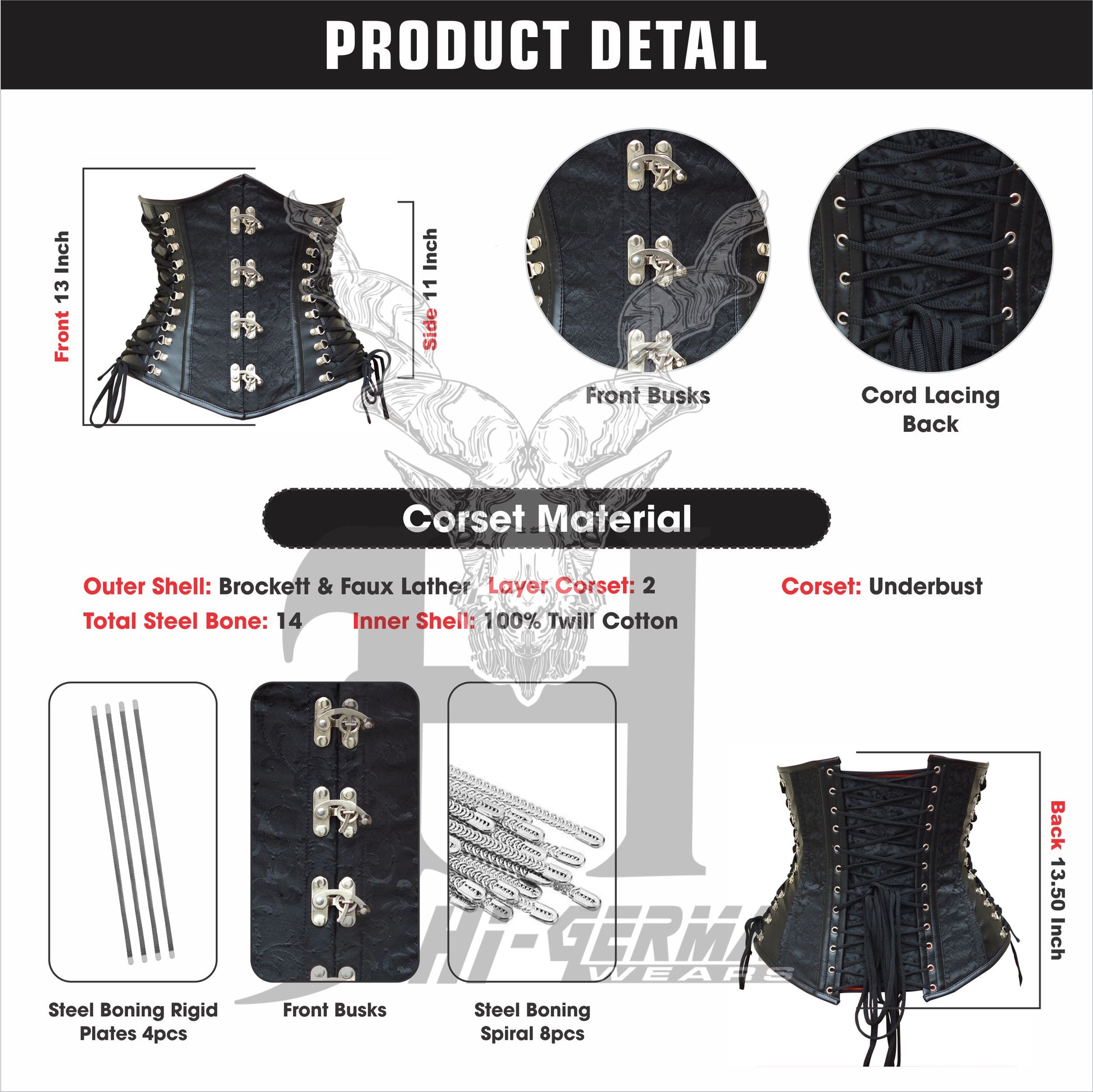 The Women’s Heavy Duty Steel Boned Underbust Steampunk Corset by HI-GERMANWEARS is designed to create an hourglass figure with strong waist shaping and support.