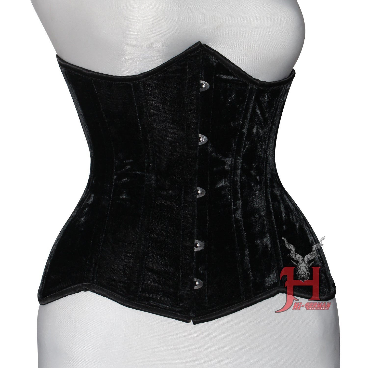 The Handmade Women’s Black Velvet Underbust Corset Hi-122 by HI-GERMANWEARS is designed to shape the waist, provide firm support, and create a bold, luxurious gothic or alternative look.