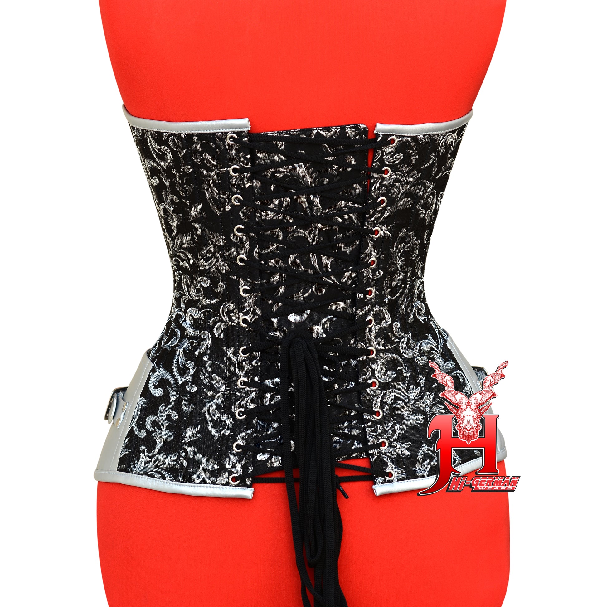 The Women’s Heavy Duty Overbust Silver Brocade Corset by HI-GERMANWEARS is designed for strong bust and waist shaping with a striking steampunk aesthetic.