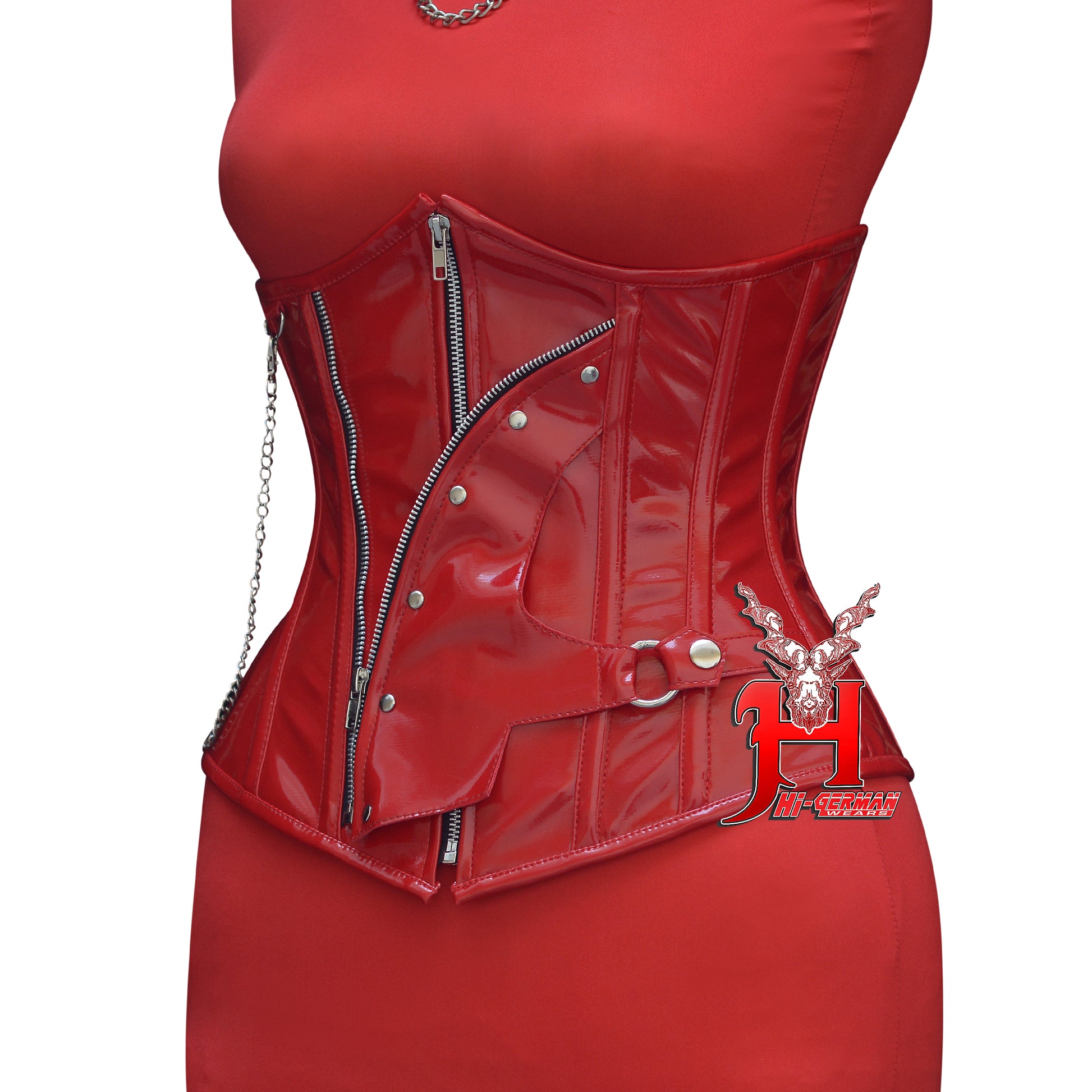 Das Unterbrust-Korsett aus rotem PVC mit Stahlstäben von HI-GERMANWEARS kombiniert starke Taillenformung mit einem markanten Gothic-Ketten-Design.