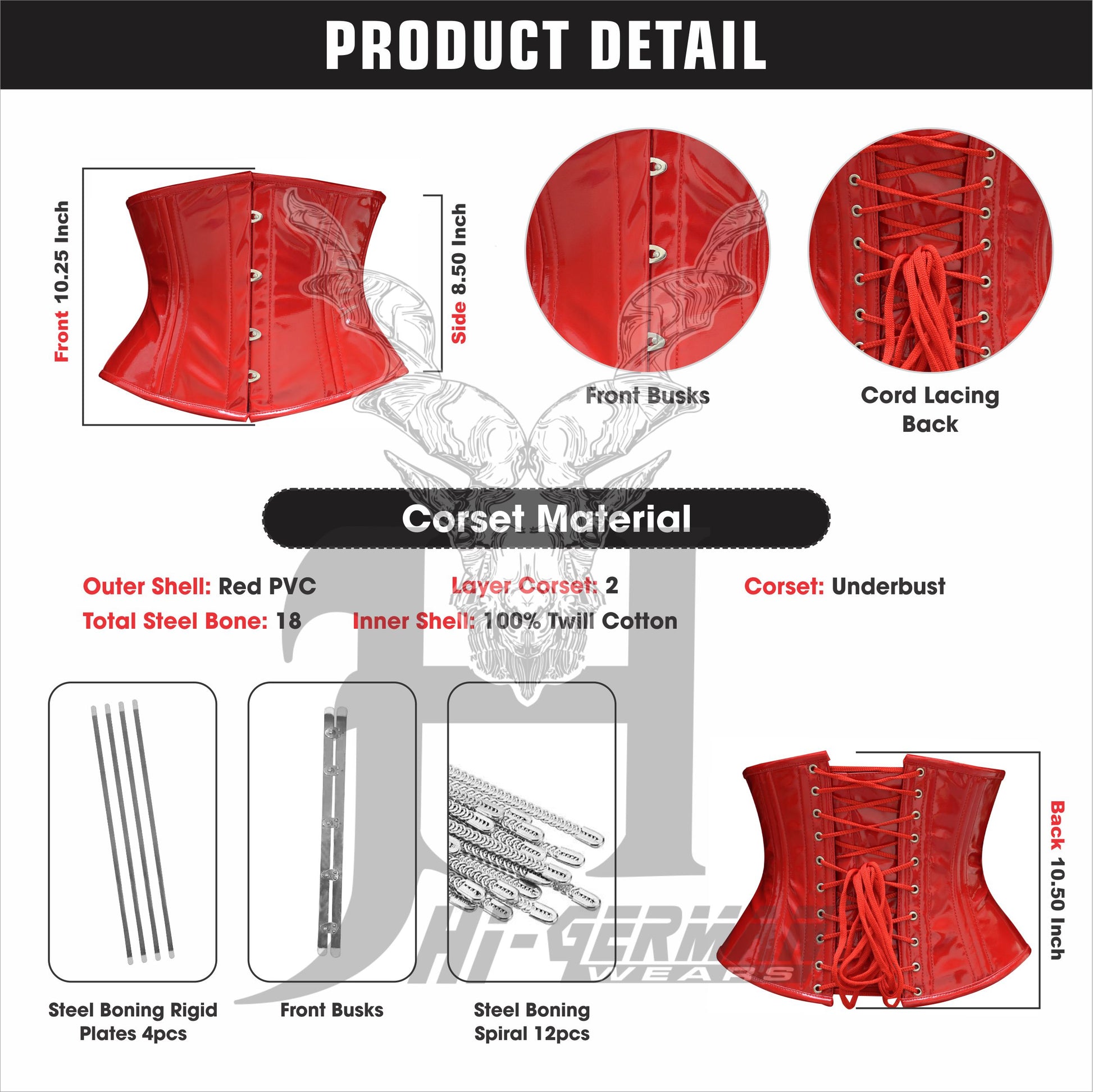 This underbust corset is made from premium red PVC with double steel boning for maximum waist shaping and support.