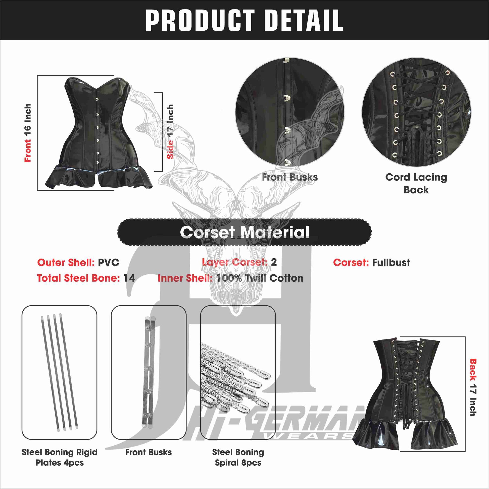 This overbust corset is made from premium black PVC with steel boning for strong waist and bust shaping.