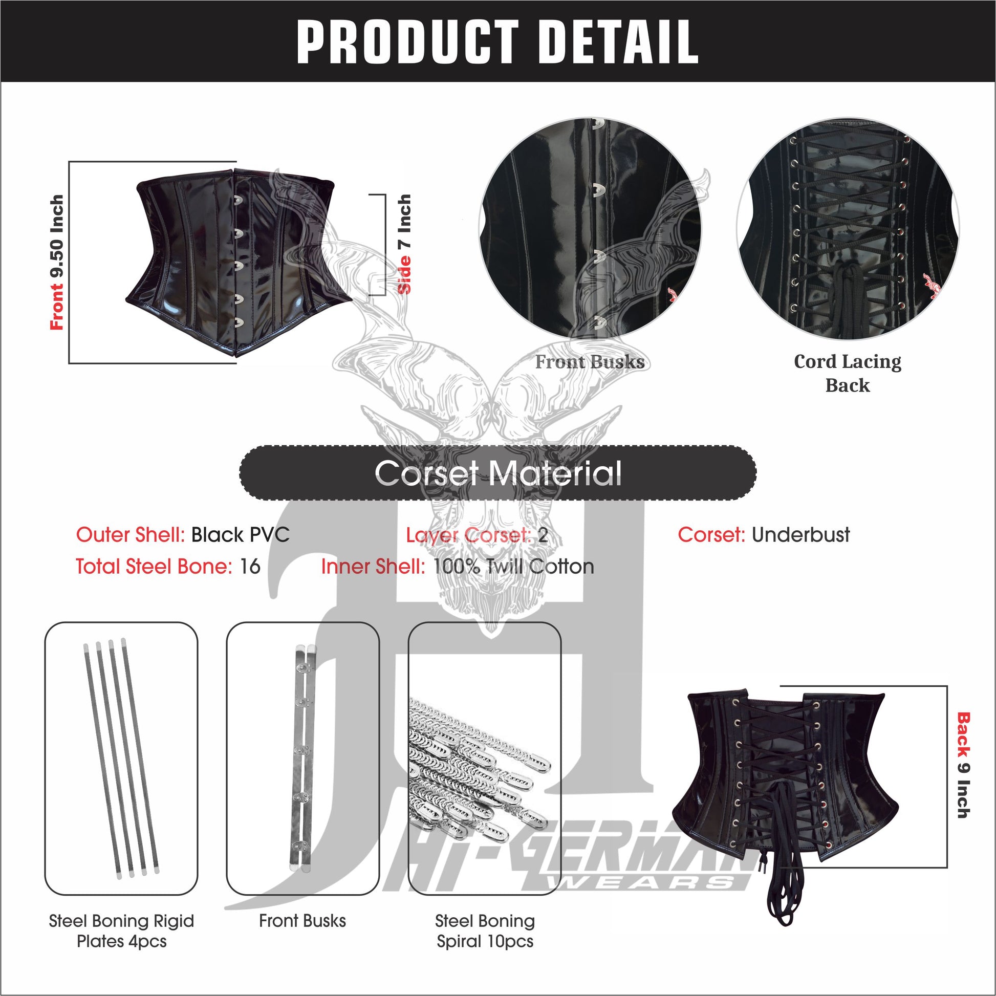 The Women’s Underbust Black PVC Steel Boned Corset by HI-GERMANWEARS is designed for effective waist shaping, posture support, and gothic style.