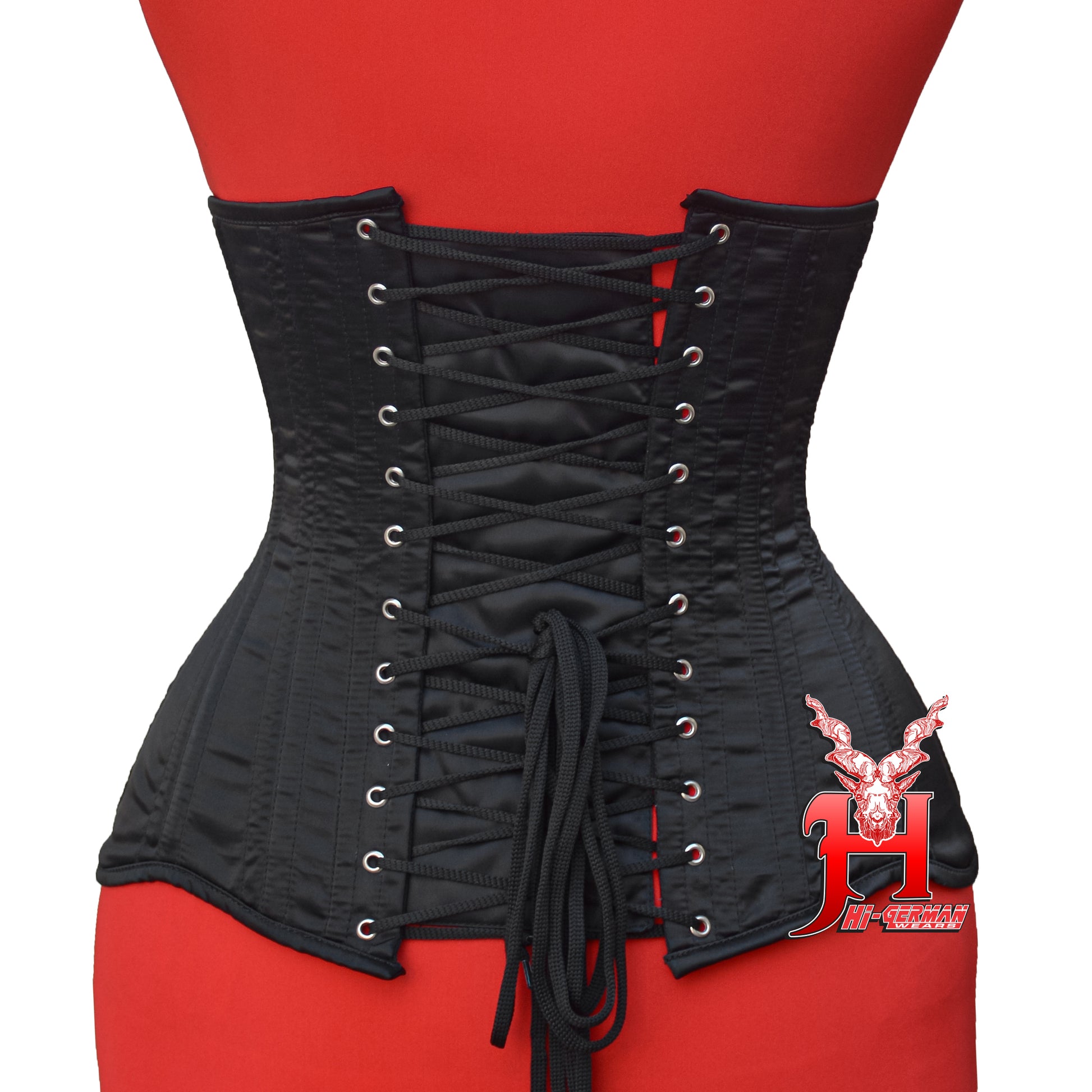 The Women’s Underbust Black Satin Double Steel Boned Corset by HI-GERMANWEARS is designed to shape the waist, provide strong support, and create a bold gothic or alternative look.