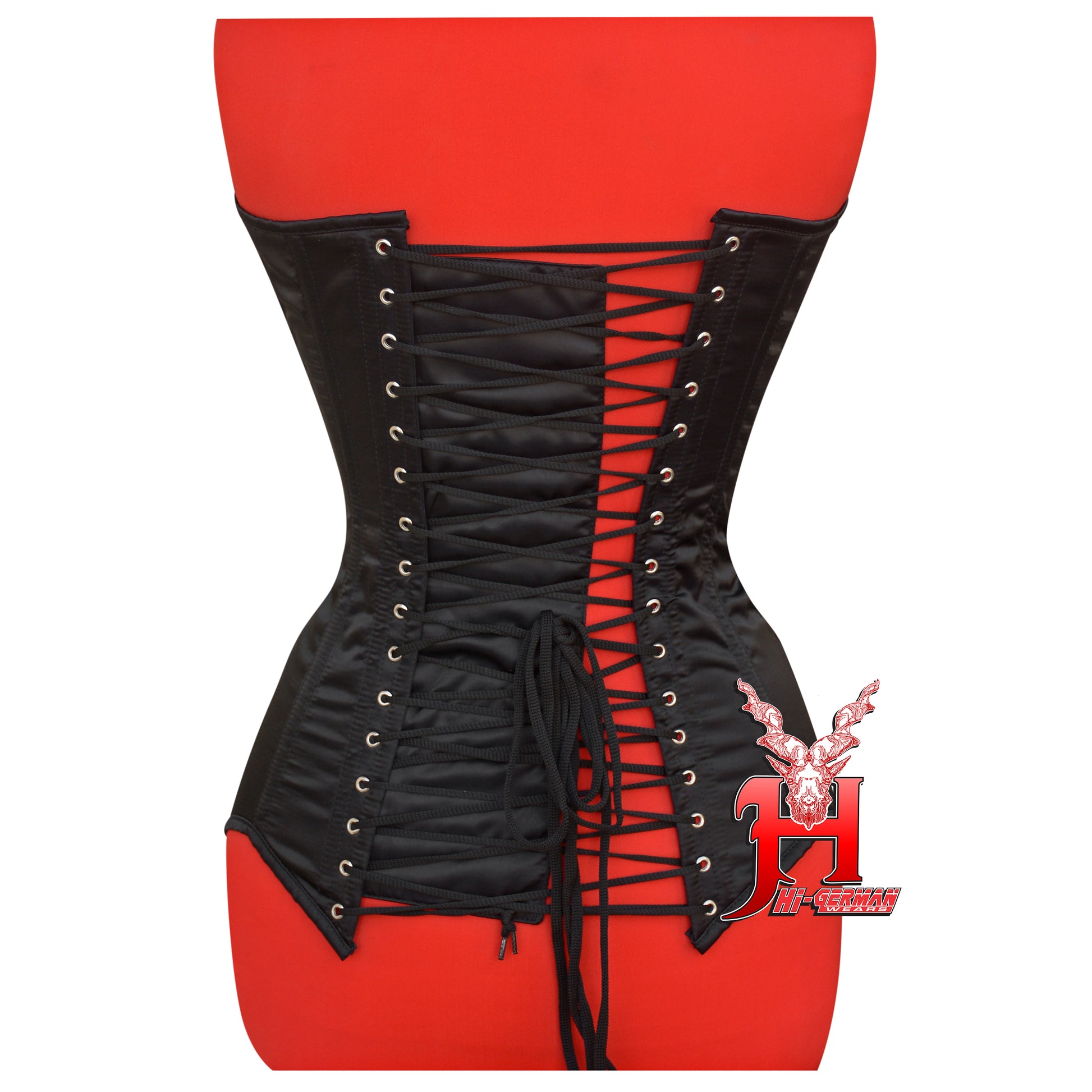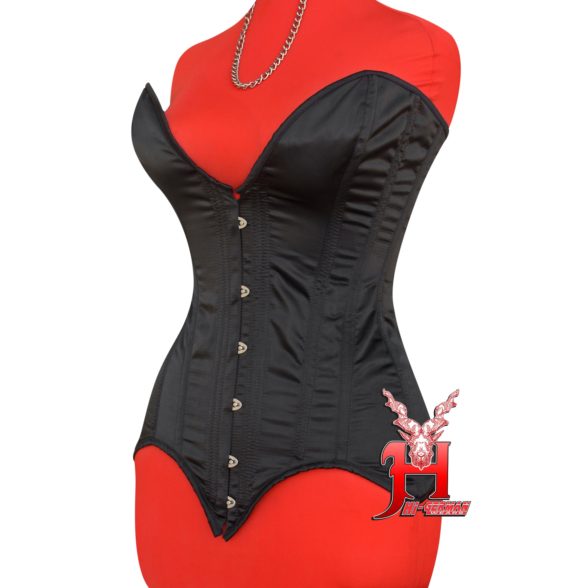 Women’s Overbust Long Torso Black Satin Corset – Doppelstahl Überbrust Korsett Deep Neck Waist Trainer