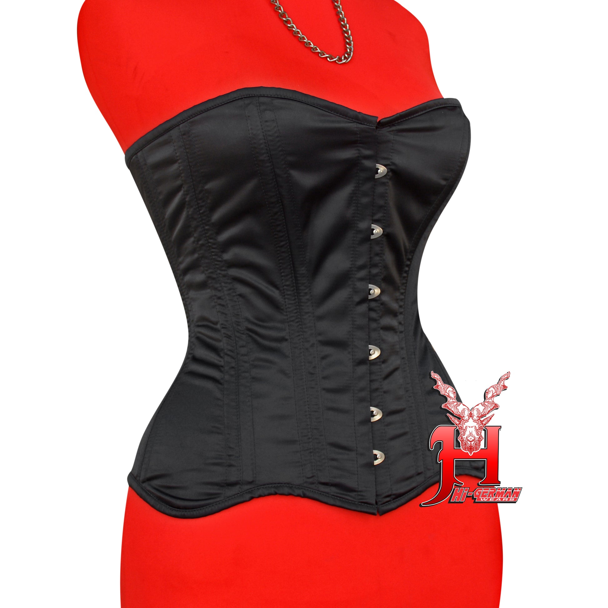 Das Überbrust-Korsett aus schwarzem Satin von HI-GERMANWEARS formt Brust und Taille effektiv, bietet festen Halt und sorgt für einen auffälligen Gothic- oder Alternative-Look.