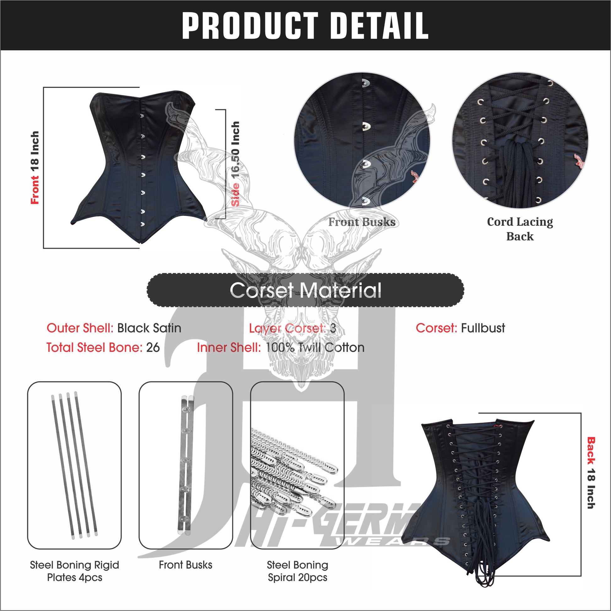 The Women’s Overbust Black Satin Long Torso Corset by HI-GERMANWEARS is designed to shape the bust and waist, provide strong support, and create a bold gothic or alternative look.