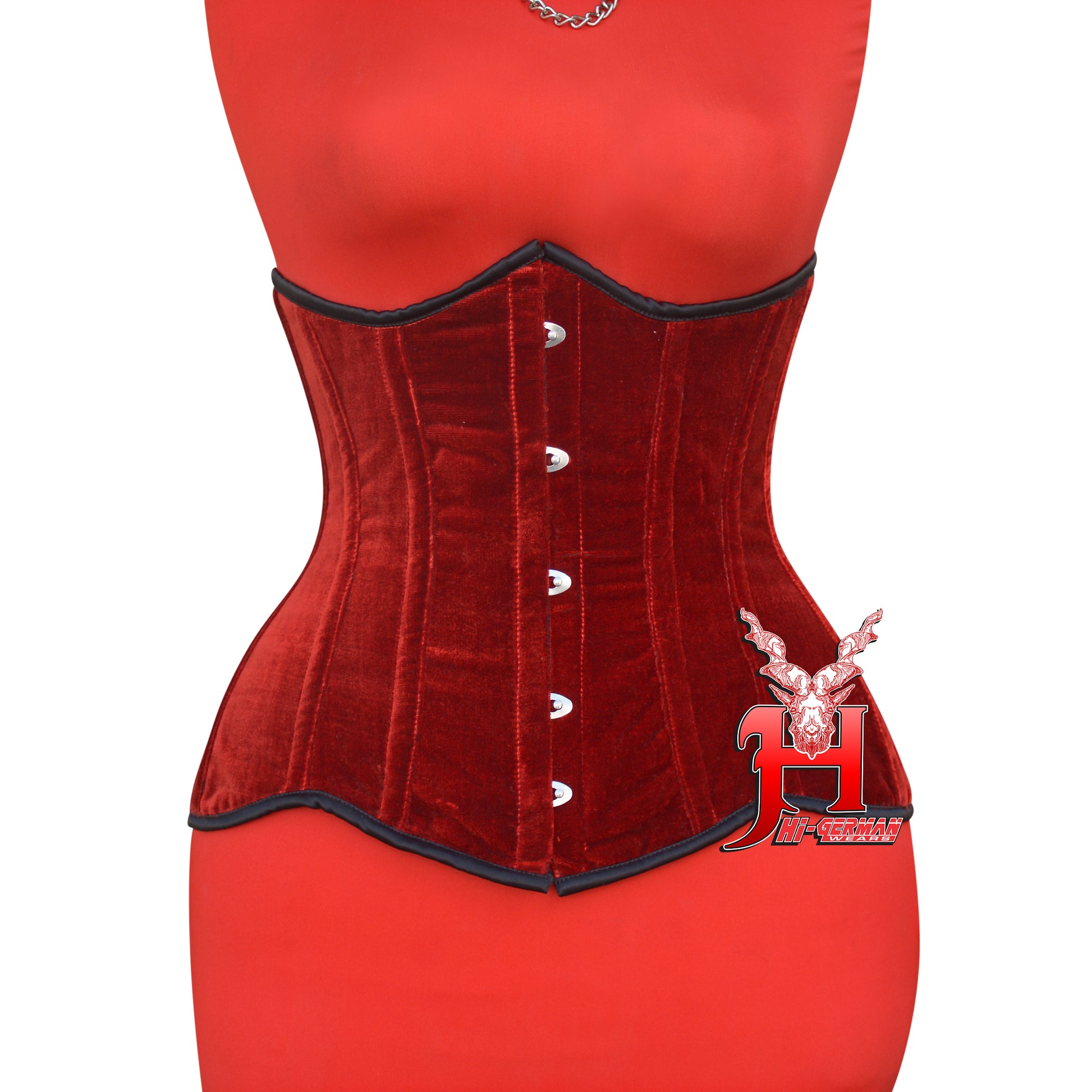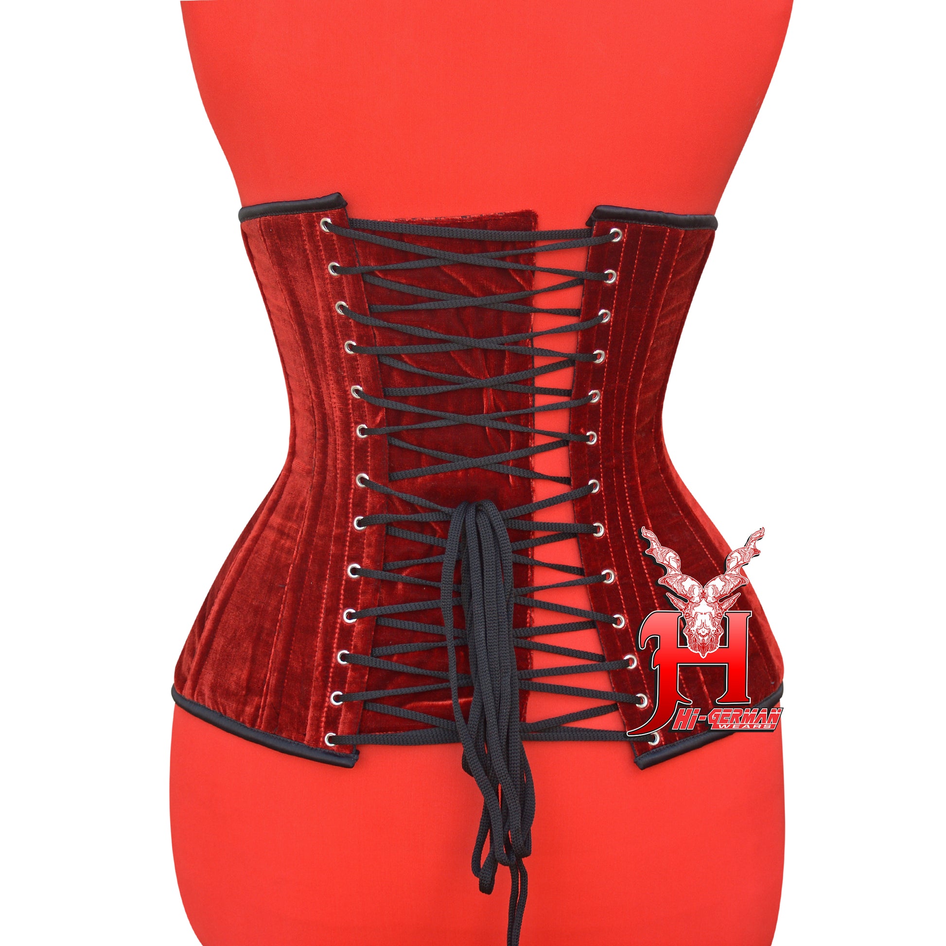 The Women’s Red Velvet Underbust Corset by HI-GERMANWEARS is designed to shape the waist, provide firm support, and create a bold and luxurious gothic or alternative look.